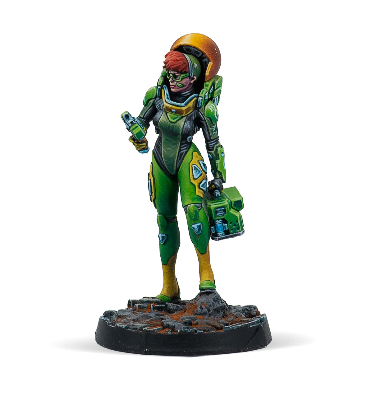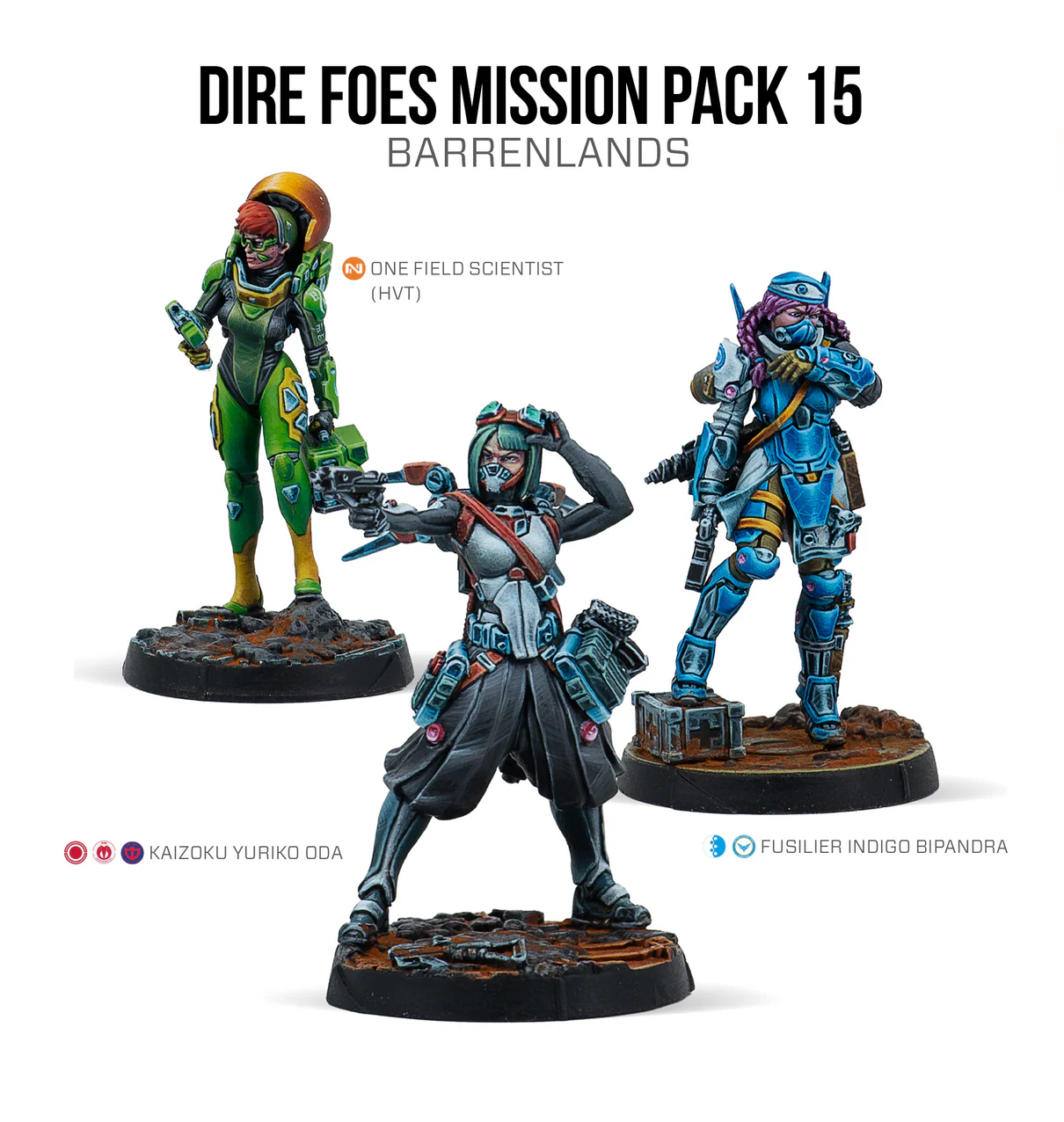 This box includes three metal miniatures: one Indigo Fusilier Bipandra with Combi Rifle, one Kaizoku Yuriko Oda armed with Combi Rifle, and one Field Scientist as HVT. With this box, you can not only expand your collection of Infinity miniatures, but you will get new options for your army—giving them personality with these two heroes—and also a neutral model to play missions and scenarios.