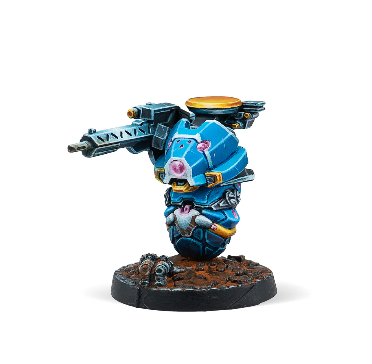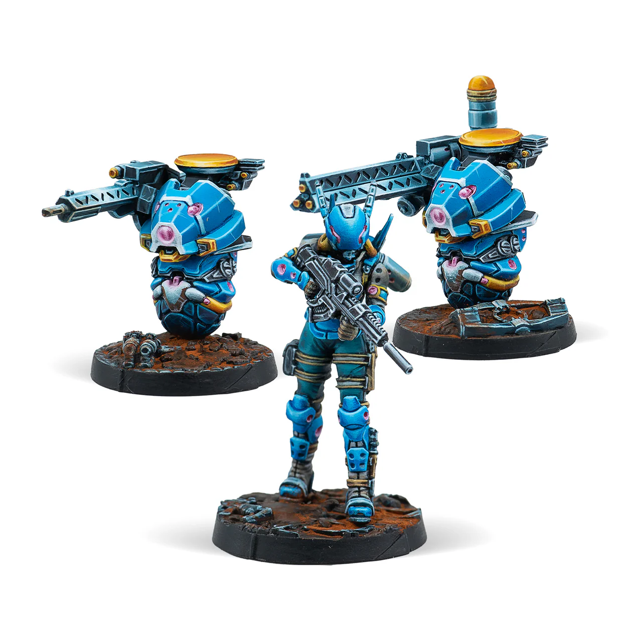 This box includes three miniatures for PanOceania: one Drummer with Marksman Rifle, one Drumbot armed with a Feuerbach, and one Drumbot with an HMC. A lightweight and highly mobile option to provide heavy fire support to your PanOceanian combat force from the Operation: Sandtrap Battle Pack.