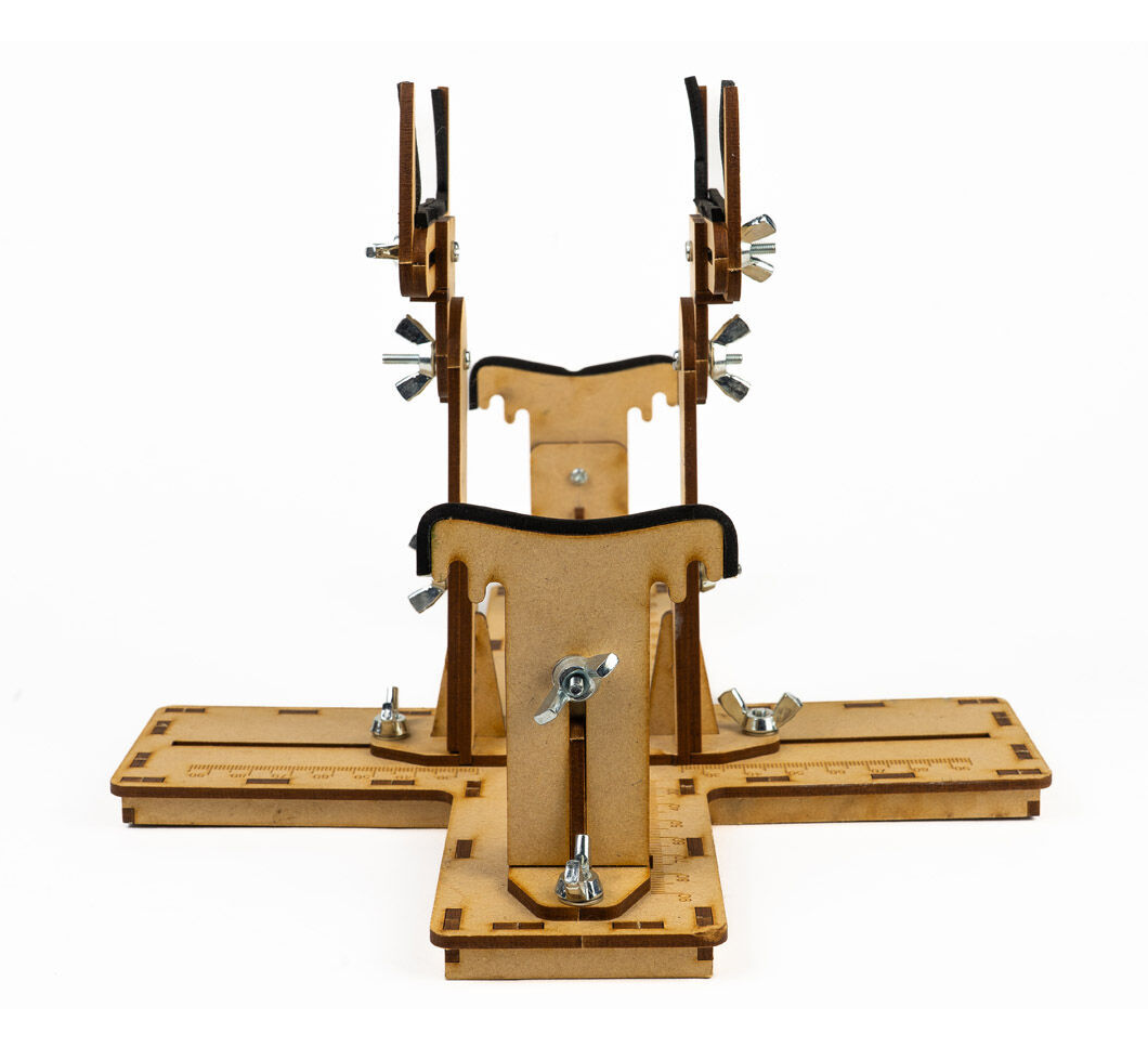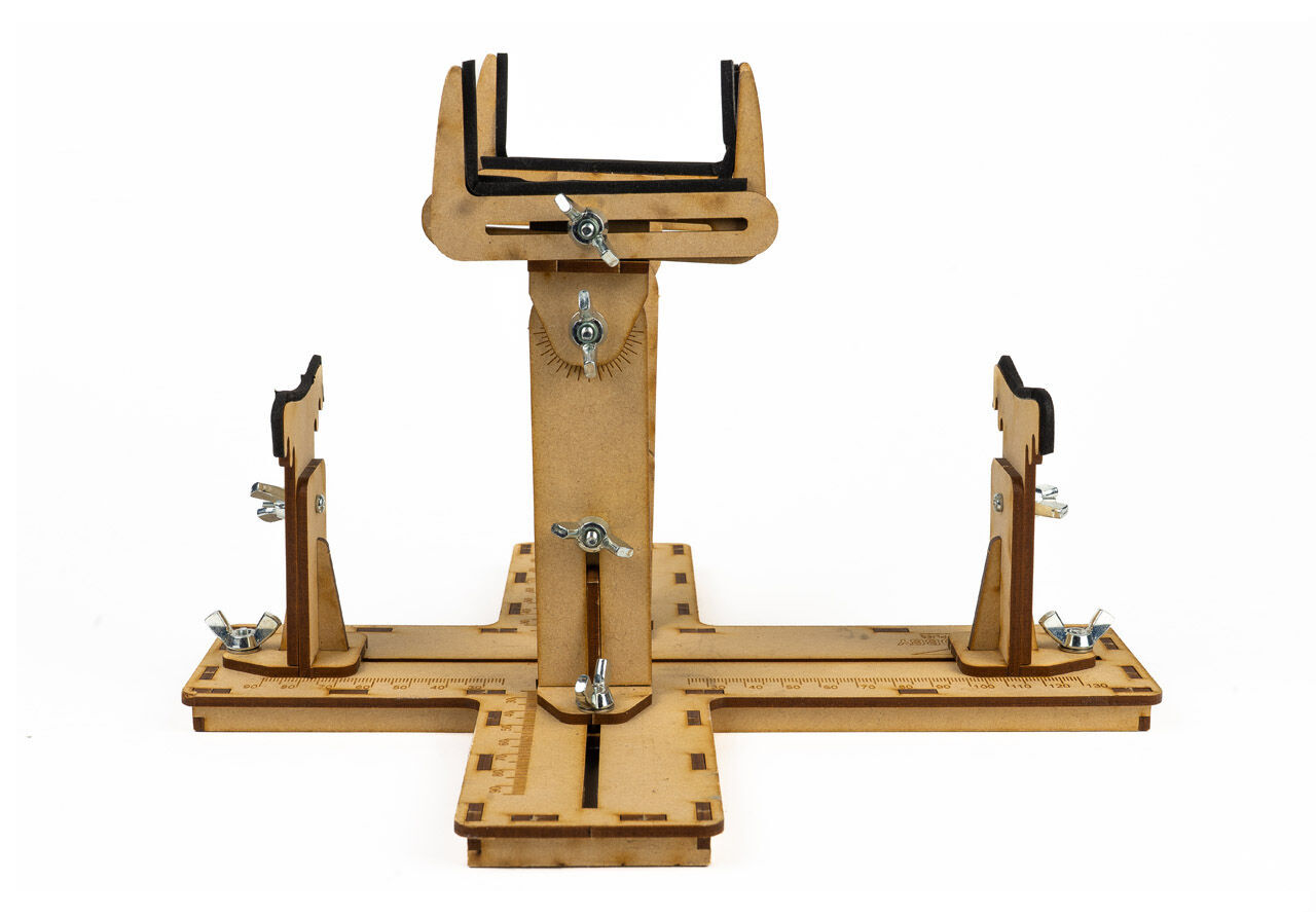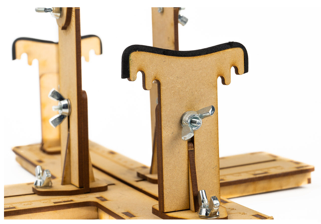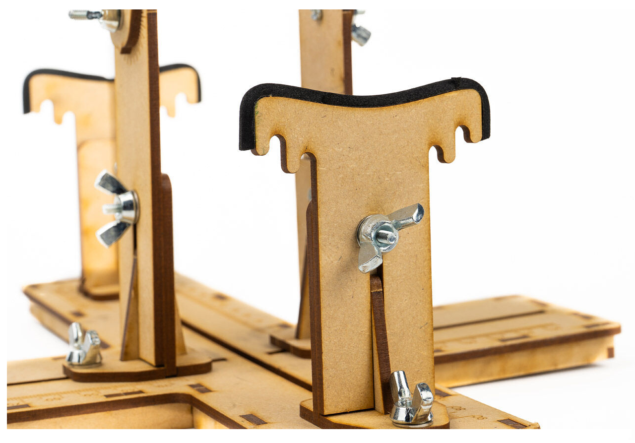 The top arms of the jig feature foam-lined cradles to securely support your model without damaging the surface. Each cradle is fully adjustable via wingnuts, allowing precise positioning to suit different fuselage widths and angles.