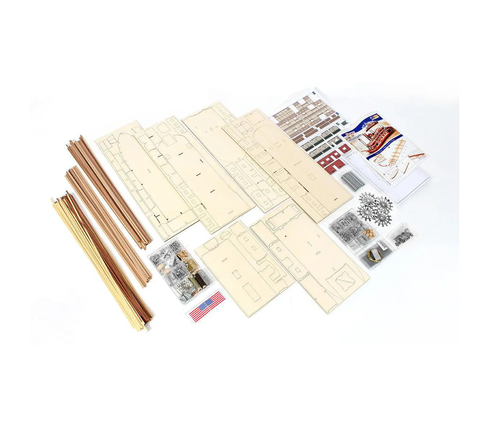 The completed model is faithful to the ship and this miniature replica measures 740mm in length, has a beam of 150mm and is 325mm tall. The kit provides full colour instructions with photographs. Three types of timber are included - Sapelli, Sycamore and African Walnut. In addition white metal and brass parts are included.
