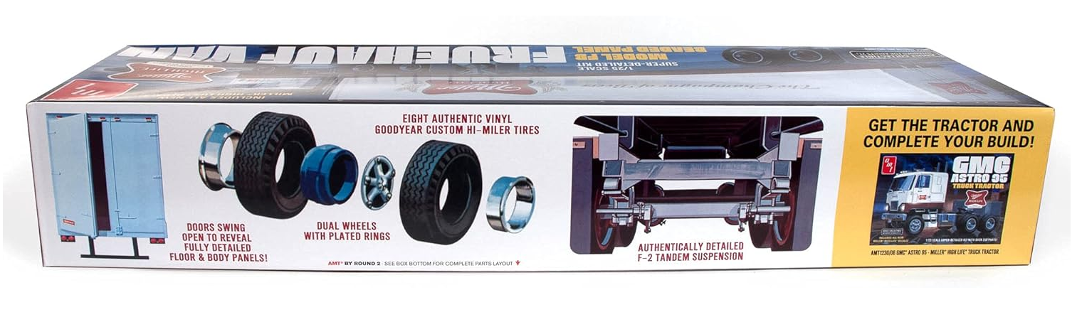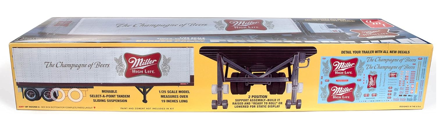 BIG ON DETAIL: Loaded with authentic details, the Fruehauf Van includes: movable select-a-point tandem sliding suspension, 2 support assembly positions, functional rear doors, dual wheels with plated rings, and more! Fully paintable, with ALL NEW Miller High Life water-slide decals and vintage-style packaging which will WOW your friends!