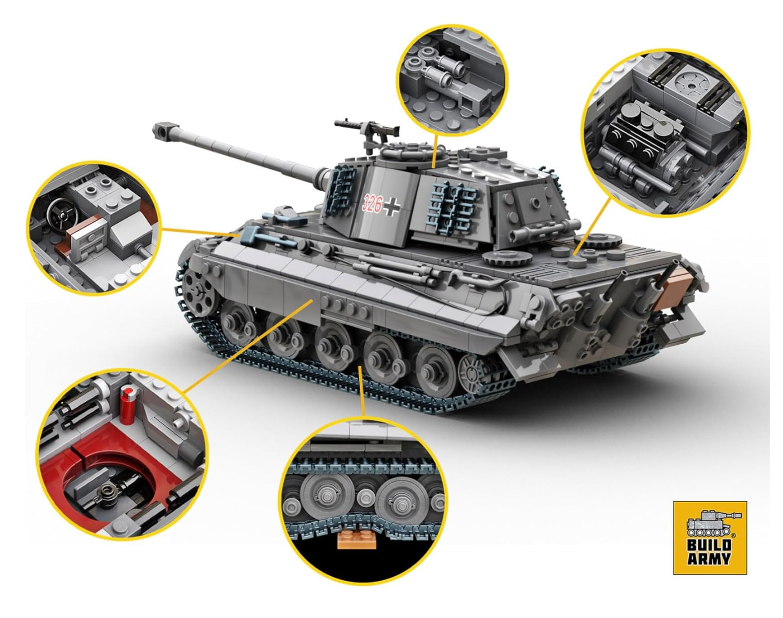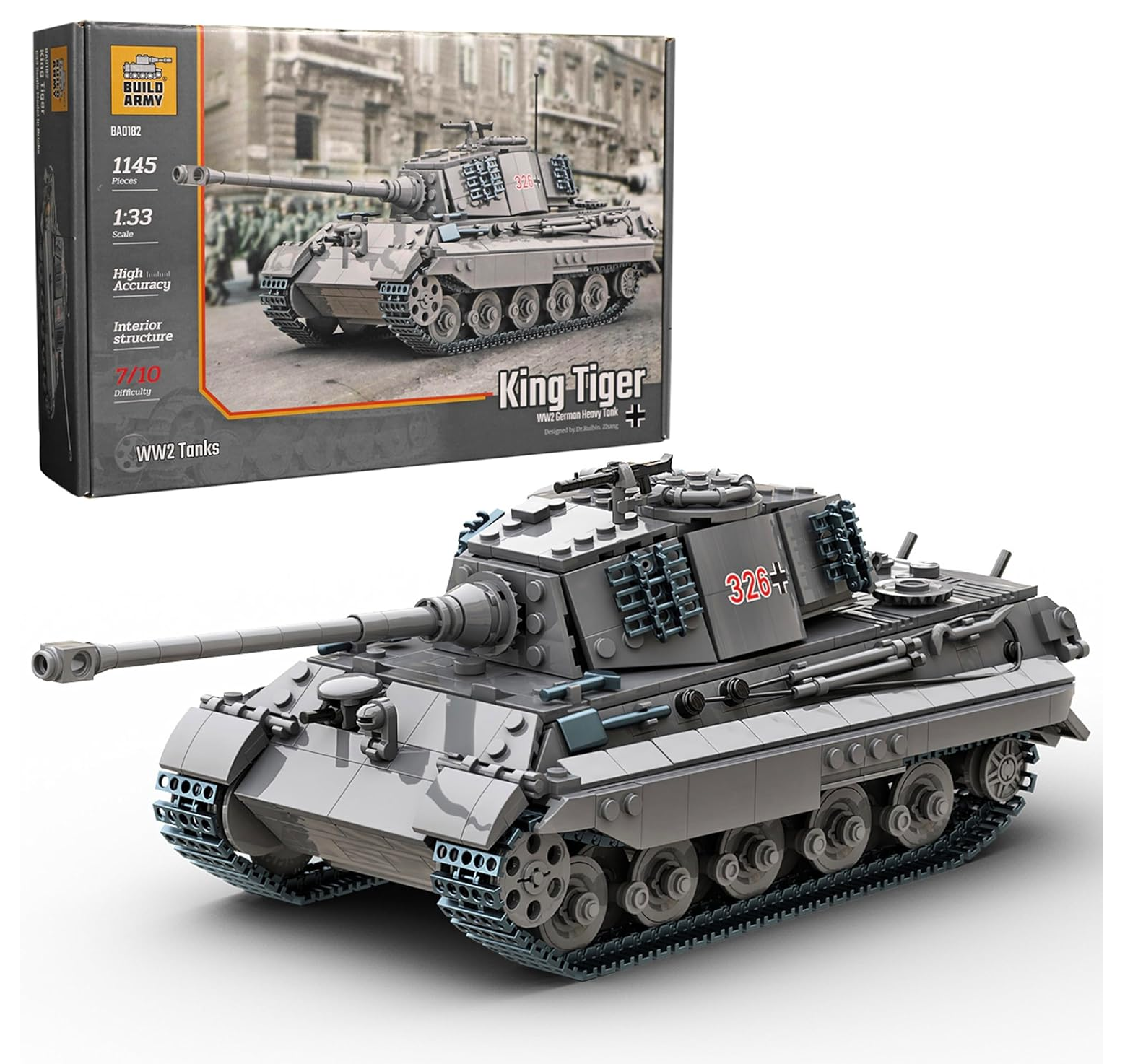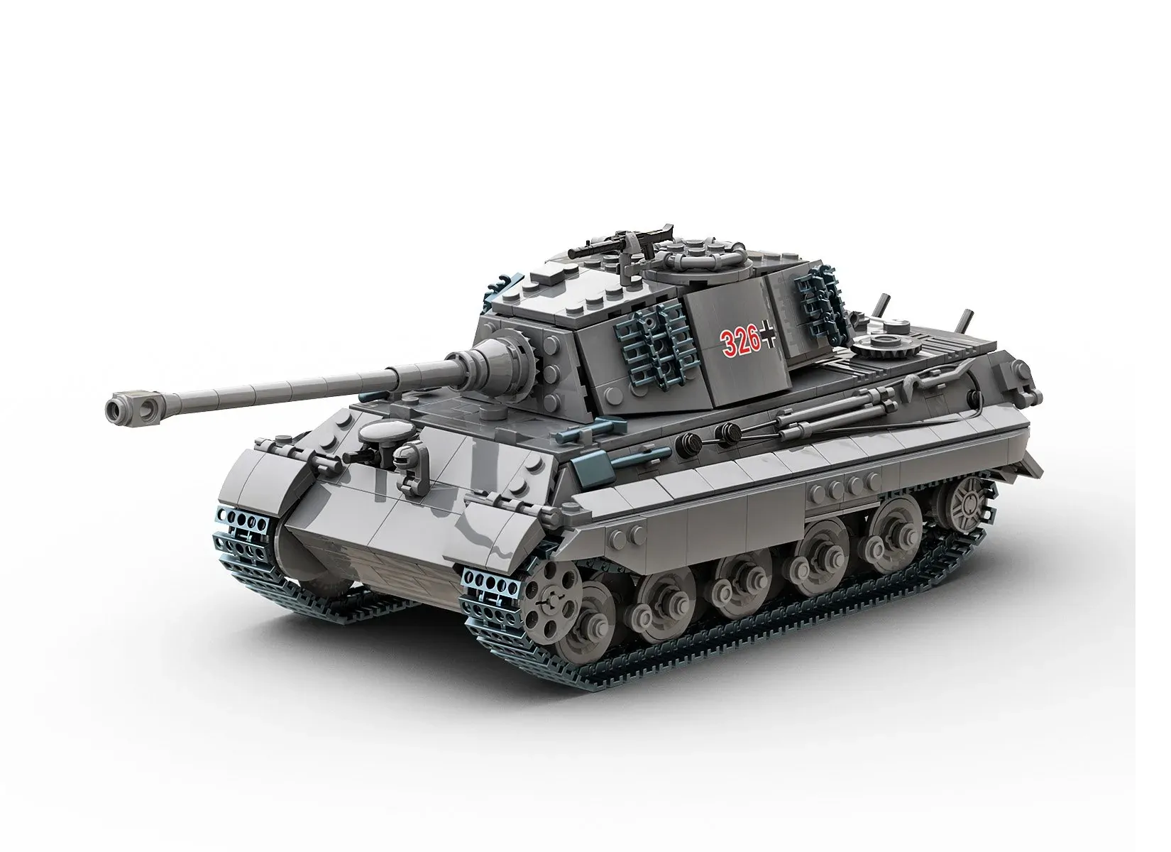 This impressive 1145-piece set is the largest creation in our WW2 tank series. It authentically replicates the legendary King Tiger at a 1:33 scale, meticulously showcasing its massive structure and formidable armour.
