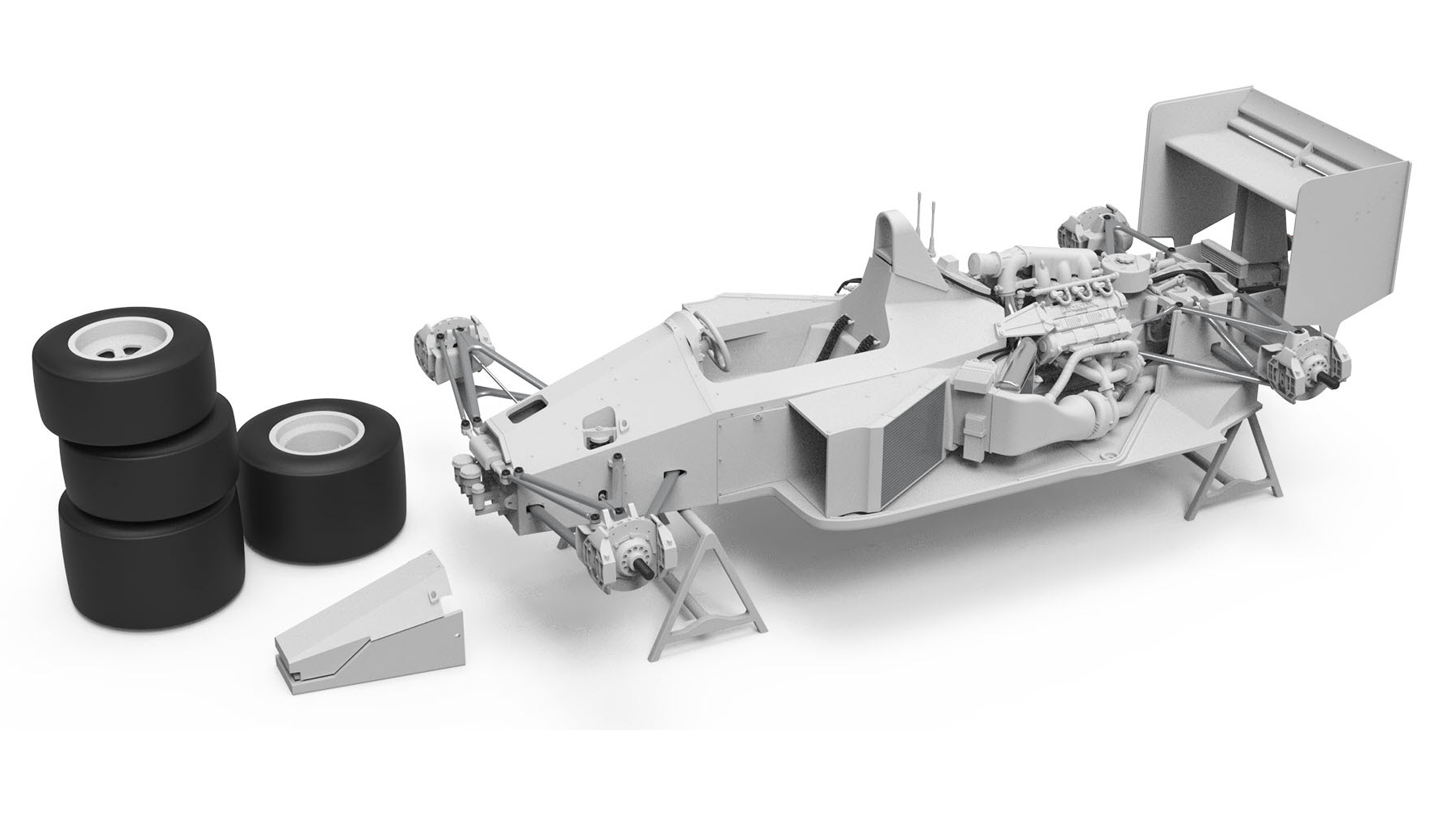 The new Meng 1/24 scale McLaren MP4/4 plastic model kit looks like a scaled-down version of its 1/12 scale kit. It contains just over 150 parts, crisply moulded with no flash and minimal mould lines. A small sheet of photo-etched metal (PE) and die-cut seat belts are also included. Decals for both Senna and Prost and a large sheet of templated carbon-fibre and Kevlar decals for the chassis are provided.